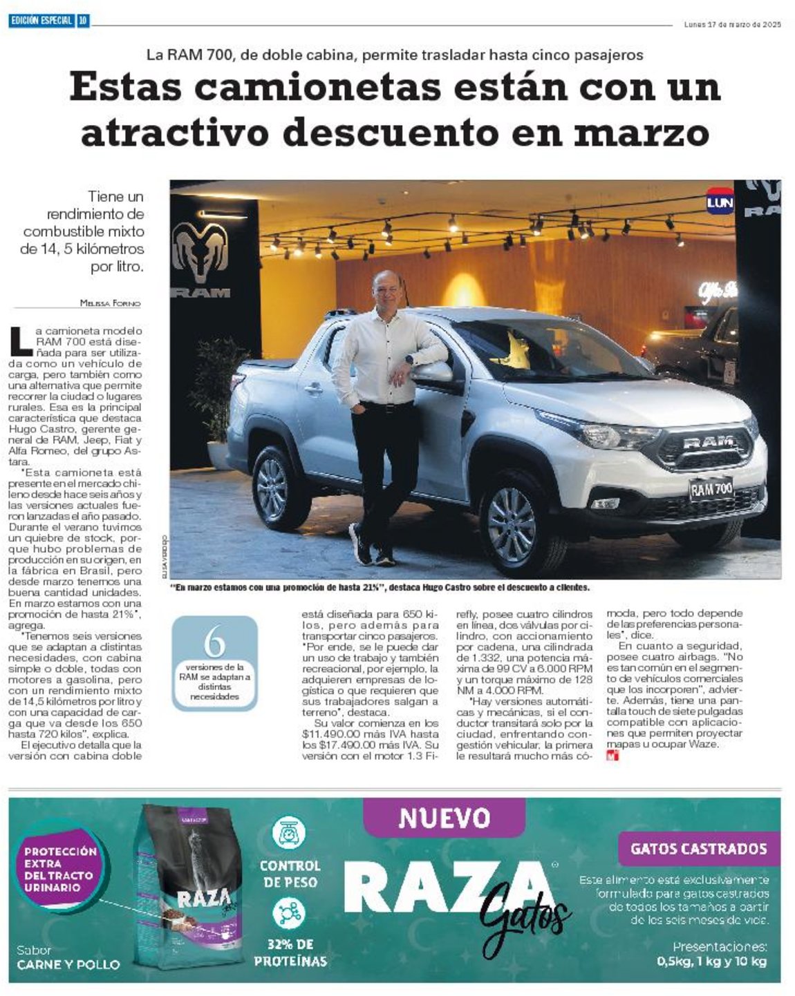 La camioneta modelo RAM 700 está diseñada para ser utilizada como un vehículo de carga, pero también como una alternativa que permite recorrer la ciudad o lugares rurales. Esa es la principal característica que destaca Hugo Castro, gerente general de RAM, Jeep, Fiat y Alfa Romeo, del grupo Astara.