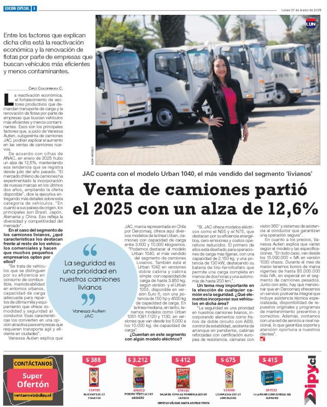 Vanessa Autien explica que JAC, marca representada en Chile por Dercomaq, ofrece aquí diversos modelos de la línea Urban, camiones con capacidad de carga entre 3.600 y 10.000 kilogramos. "Podemos destacar al modelo Urban 1040, el más vendido del segmento de camiones Livianos. También está el Urban 1042 en versiones doble cabina y cabina simple -con capacidad de carga de hasta 3.850 kg. según versión- y el Urban 1055, disponible en versión Euro 6, con una potencia de 150 hp y 4500 kg de capacidad de carga. En la línea mediana, en tanto, tenemos modelos como Urban 1061-1081-1120 y 1130, en versiones que van desde los 5.000 a los 10.000 kg. de capacidad de carga".