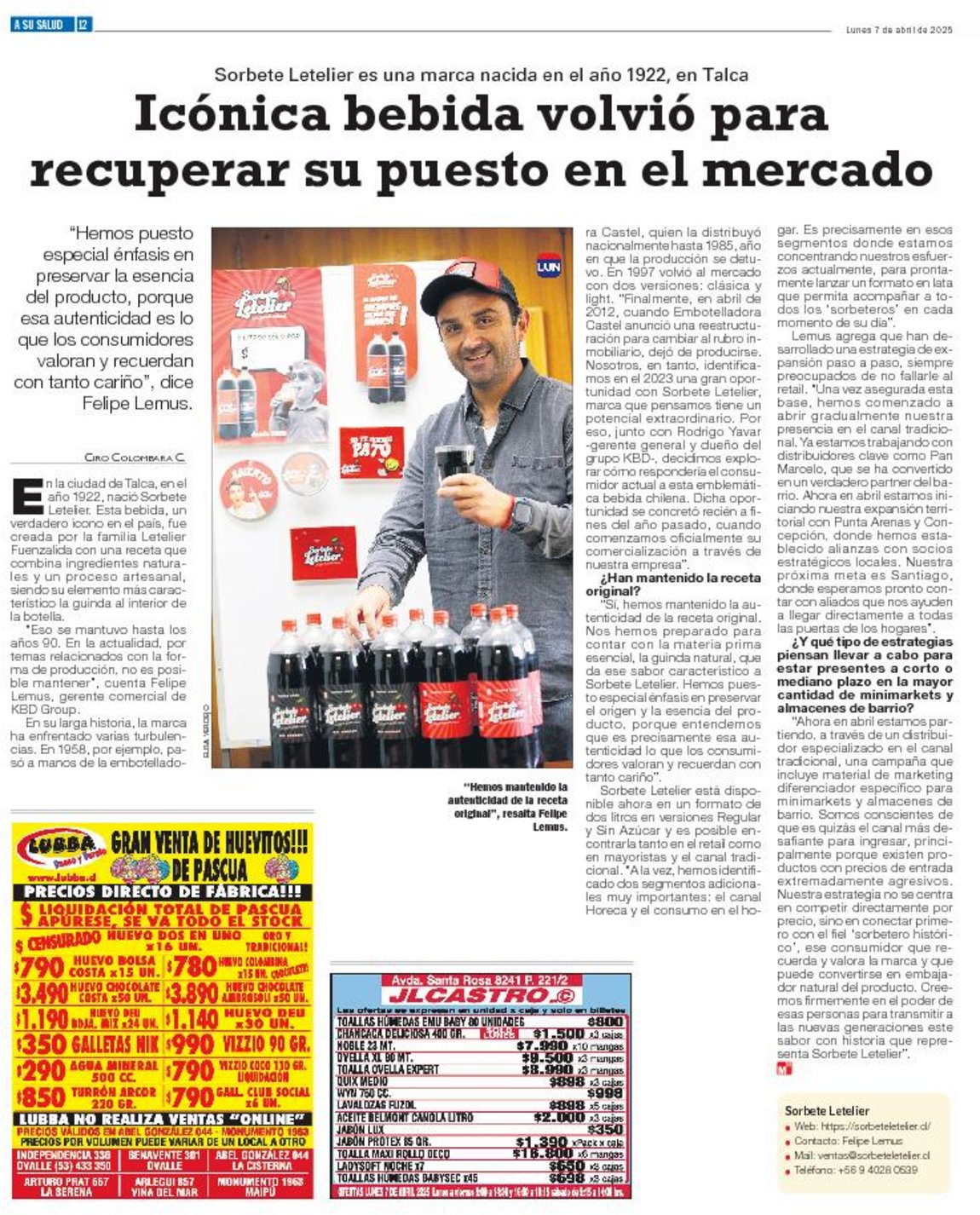 En su larga historia, la marca ha enfrentado varias turbulencias. En 1958, por ejemplo, pasó a manos de la embotelladora Castel, quien la distribuyó nacionalmente hasta 1985, año en que la producción se detuvo. En 1997 volvió al mercado con dos versiones: clásica y light. "Finalmente, en abril de 2012, cuando Embotelladora Castel anunció una reestructuración para cambiar al rubro inmobiliario, dejó de producirse. Nosotros, en tanto, identificamos en el 2023 una gran oportunidad con Sorbete Letelier, marca que pensamos tiene un potencial extraordinario. Por eso, junto con Rodrigo Yavar -gerente general y dueño del grupo KBD-, decidimos explorar cómo respondería el consumidor actual a esta emblemática bebida chilena. Dicha oportunidad se concretó recién a fines del año pasado, cuando comenzamos oficialmente su comercialización a través de nuestra empresa".