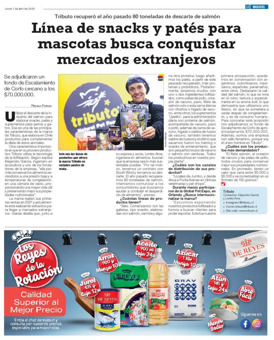 Utilizar el descarte de la industria del salmón para elaborar snacks, patés y suplementos para perros y gatos. Esa es una de las principales características de la marca de Tributo, que elabora en Chile productos para complementar la dieta de estos animales.
