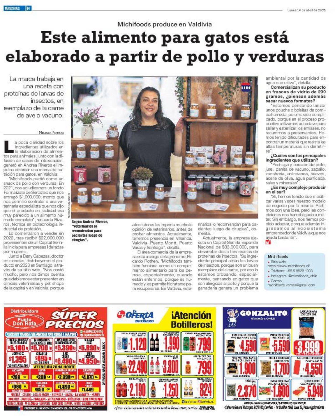 "Michifoods partió como un snack de pollo con verduras. En 2021, nos adjudicamos un fondo Formalízate de Sercotec que nos entregó $1.000.000, monto que nos permitió contratar a una veterinaria especialista que nos dijo que el producto en realidad era muy parecido a un alimento húmedo completo", recuerda Riveros, técnica en biotecnología industrial de profesión.
