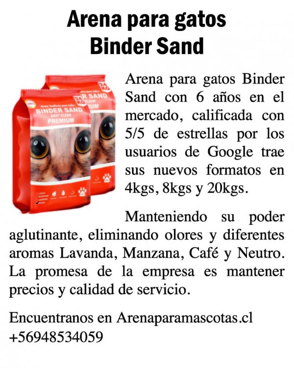 Arena para gatos Binder Sand con 6 años en el mercado, calificada con 5/5 de estrellas por los usuarios de Google trae sus nuevos formatos en 4Kgs, 8Kgs y 20Kgs.