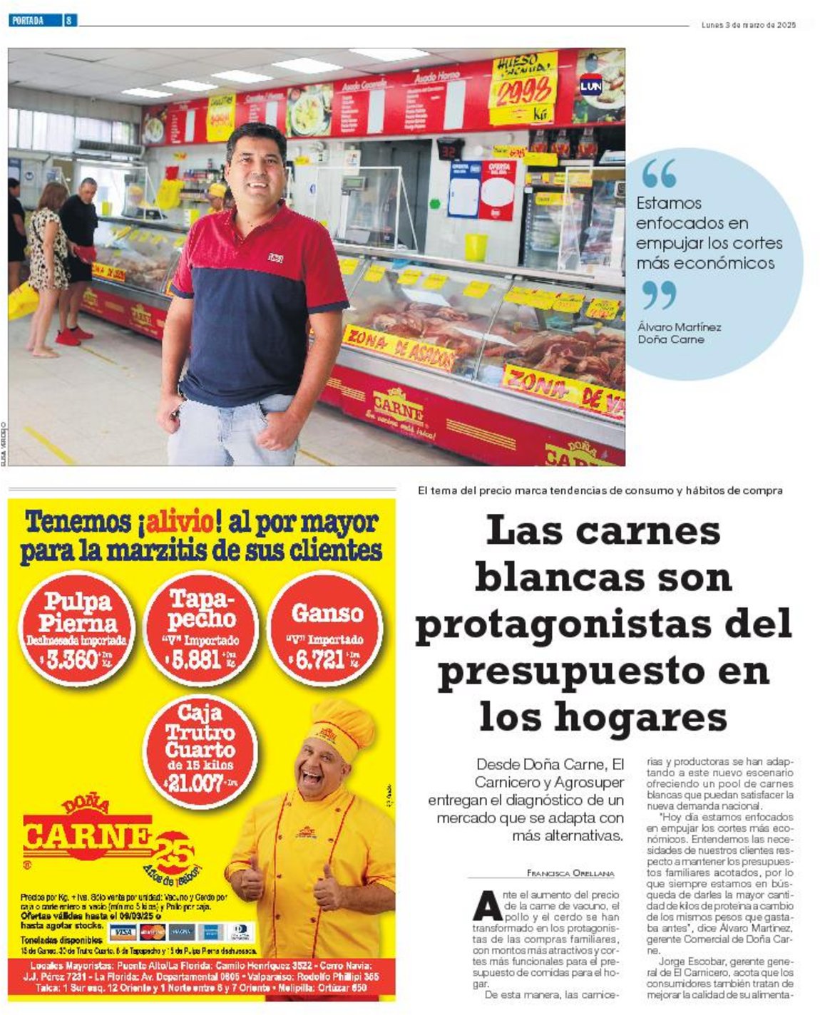 "Hoy día estamos enfocados en empujar los cortes más económicos. Entendemos las necesidades de nuestros clientes respecto a mantener los presupuestos familiares acotados, por lo que siempre estamos en búsqueda de darles la mayor cantidad de kilos de proteína a cambio de los mismos pesos que gastaba antes", dice Álvaro Martínez, gerente Comercial de Doña Carne.